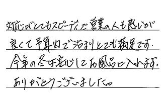 対応がとてもスピーディで、営業の人も感じが良くて、予算内で収まり、とても満足です。今年の冬は安心してお風呂に入れます。ありがとうございました。