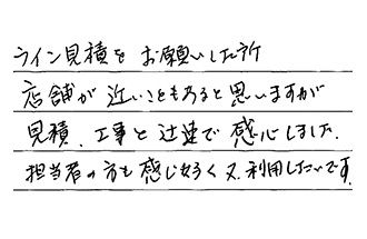 ライン見積をお願いした所、店舗が近いこともあると思いますが、見積、工事と迅速で、感心しました。担当者の方も感じ好く、又、利用したいです。