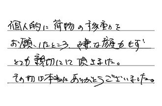 個人的に荷物の移動をお願いしたところ、嫌な顔もせず、とても親切にして頂きました。その節は本当にありがとうございました。
