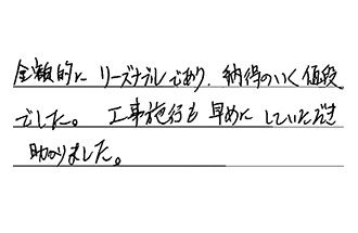 工事の方(仕事もていねいで、道具もきちんと整理されていた)が、汚れている所をきれいにしてのち、設置していただき、その対応が本当に良いと思った。この方は信用できると思った。