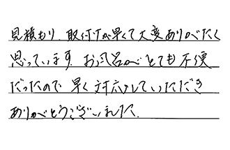 見積もり、取付けが早くて、大変ありがたく思っています。お風呂がとても不便だったので、早く対応していただき、ありがとうございました。