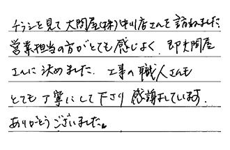 チラシを見て、大問屋(株)中川店さんを訪ねました。営業担当の方がとても感じよく、即大問屋さんに決めました。工事の職人さんもとても丁寧にして下さり、感謝しています。ありがとうございました。