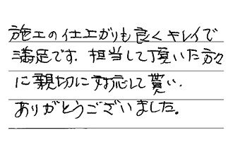 施工の仕上がりも良く、キレイで満足です。担当して頂いた方々に、親切に対応して貰い、ありがとうございました。