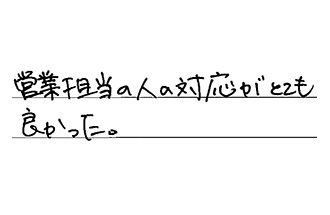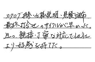 カタログ持参・仕様説明・見積り送付、最終打合せのサイクルが早かった。且つ、親切・丁寧な対応で、他社より好感を持てた。
