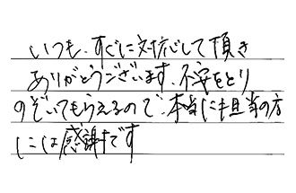 いつも、すぐに対応して頂き、ありがとうございます。不安をとりのぞいてもらえるので、本当に担当の方には感謝です。