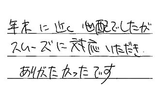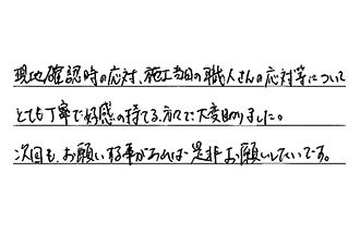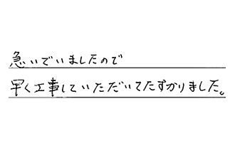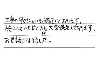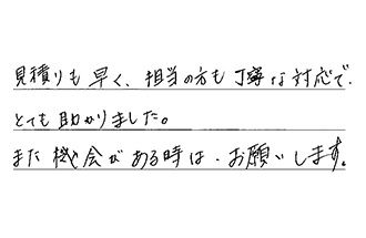 初めて工事をしていただいたが、手早く感じよく満足しています。ありがとうございました。又、何かありましたら、お願いします。