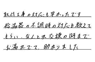 以前にもガス給湯器のとりかえ工事をしていただきましたが、ていねいな仕事で、満足しました。