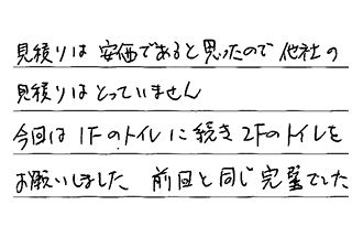 見積りは安価であると思ったので、他社の見積りはとっていません。今回は1Fのトイレに続き、2Fのトイレをお願いしました。前回と同じ完璧でした。
