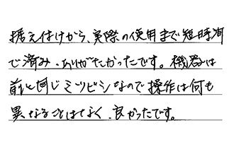 据え付けから、実際の使用まで、短時間で済み、ありがたかったです。機器は前と同じミツビシなので、操作は何も異なることはなく、良かったです。