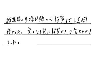 給湯器の見積依頼から設置まで、1週間程でした。寒くなる前に設置でき、大変助かりました。
