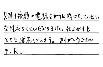 見積り依頼の電話をかけた時から、ていねいな対応をしていただきました。仕上がりもとても満足しています。ありがとうございました。