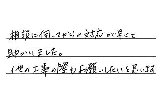 初めて電話した時から、工事が完了するまで、とても速く、満足です。また何かあった時は、お願いしたいと思いました。
