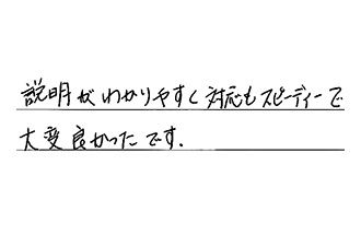 総合的に対応がとても良かったです。また何かあった時には、御社にお願いしたいと思える対応をしていただきました。ありがとうございました。