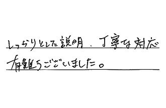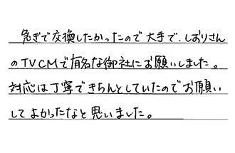 急ぎで交換したかったので、大手で、しおりさんのTVCMで有名な御社にお願いしました。対応は丁寧で、きちんとしていたので、お願いしてよかったなと思いました。