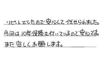 リピートでしたので、安心して任せられました。今回は10年保証も付いているので安心です。また宜しくお願いします。