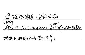 対応の早さ、施工の早さ、良いと感じました。また次回、他の場所をお願いしたいと感じた。