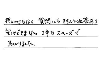 押しつけもなく、質問にもきちんと返答あり、安心できました。工事もスムーズで、助かりました。