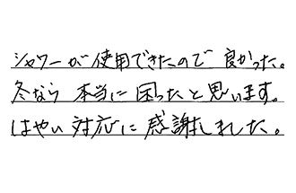 シャワーが使用できたので、良かった。冬なら本当に困ったと思います。はやい対応に感謝しました。