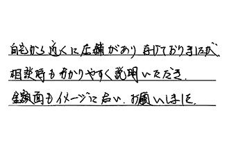 自宅から近くに店舗があり、存じておりましたが、相談時も分かりやすく説明いただき、金額面もイメージに合い、お願いしました。