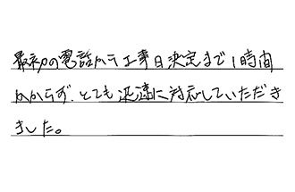 最初の電話から工事日決定まで、1時間かからず、とても迅速に対応していただきました。
