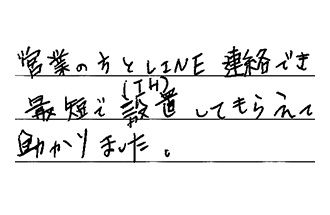 今まで、トイレ1F・2F、換気扇、風呂給湯器、今回のガスコンロと、迅速な対応をして頂き、たすかりました。これからもよろしくお願いしますね。