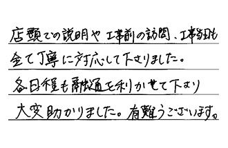 商品知識に詳しく、質問に的確に答えてくれた。工事も速く、丁寧だった。また、お願いしてから取付までの時間が、最も短かった。実店舗があるのが大きな決め手。(直接店舗に行った。)