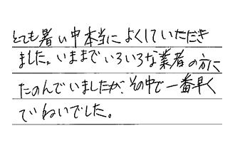 とても暑い中、本当によくしていただきました。いままでいろいろな業者の方にたのんでいましたが、その中で一番早くていねいでした。