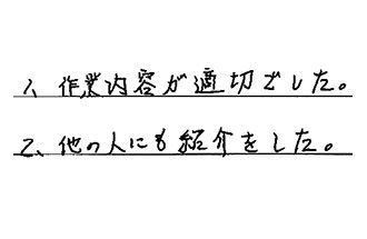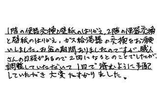 1階の便器交換と壁紙のはりかえ、2階の便器交換と壁紙のはりかえ、ガス給湯器の交換をお願いしました。お盆の期間ありましたのですが、職人さんの日程があるので、2回になるとのことでしたが、調整していただいて、1回で済むように手配していただき、大変たすかりました。