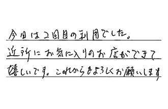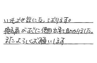いつもお世話になっております。換気扇がすぐに使用出来て、助かりました。またよろしくお願いします。