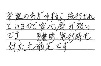 営業の方がみずから施工されているので、安心感が強いです。見積時・施工時も対応も満足です。