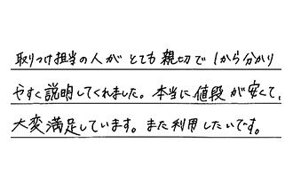 出来上がりもとてもきれいになりましたし、お値段も安くて、すべてに満足です。ありがとうございました。また、何かありましたら、よろしくお願いします。