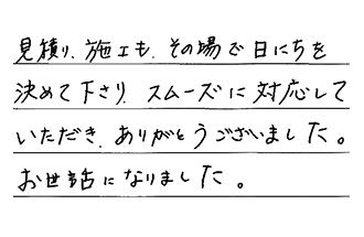見積り、施工も、その場で日にちを決めて下さり、スムーズに対応していただき、ありがとうございました。お世話になりました。