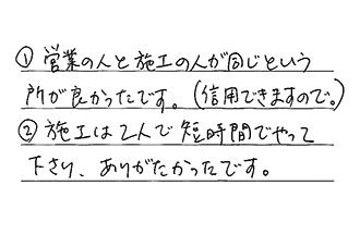 ①営業の人と施工の人が同じという所が良かったです。(信用できますので。)②施工は2人で短時間でやって下さり、ありがたかったです。
