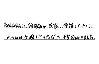 冬の時期に、給湯器が故障し、電話したところ、翌日には交換していただき、大変助かりました。