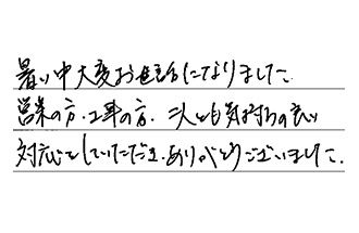 暑い中、大変お世話になりました。営業の方、工事の方、二人とも気持ちの良い対応をしていただき、ありがとうございました。