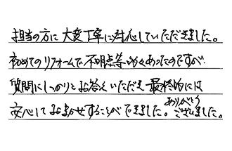 担当の方に大変丁寧に対応していただきました。初めてのリフォームで、不明点等多々あったのですが、質問にしっかりとお答えいただき、最終的には、安心しておまかせすることができました。ありがとうございました。