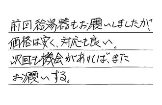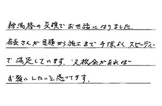 給湯器の交換でお世話になりました。店長さんが見積から施工まで、手際よくスピーディーで、満足しています。又機会があれば、お願いしたいと思ってます。