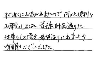 すぐ近くにお店が出来たので、何かと便利とお願いしました。皆様計画通りに仕事をして頂き、希望通りに出来上り、有難うございました。