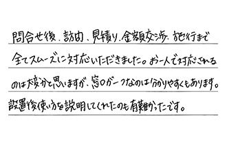 問合せ後、訪問、見積り、金額交渉、施工まで、全てスムーズに対応いただきました。お一人で対応されるのは大変かと思いますが、窓口が一つなのは、分かりやすくもあります。設置後、使い方を説明してくれたのも、有り難かったです。