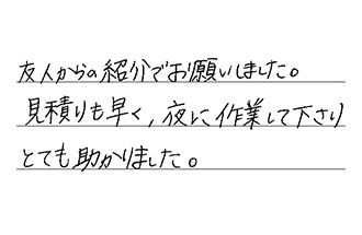 友人からの紹介でお願いしました。見積りも早く、夜に作業して下さり、とても助かりました。