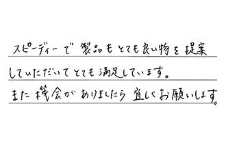 スピーディーで、製品もとても良い物を提案していただいて、とても満足しています。また機会がありましたら、宜しくお願いします。