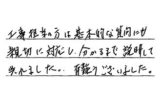 工事担当の方は、基本的な質問にも親切に対応し、分かるまで説明して呉れました。有難うございました。