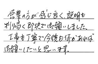 営業の方が感じ良く、説明も判り易く、即決で御願いしました。工事も丁寧で、今後も何かあれば、御願いしたいと思います。