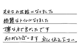 先日はお世話になりました。綺麗なトイレになりました。丁寧な方で良かったです。ありがとうございます。宜しくお伝え下さい。