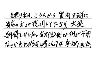 見積り当日、こちらから質問する前に、貴店の方が説明して下さり、大変納得しました。当方(客側)は何が不明なのかもわからない者にとっては、安心しました。