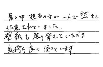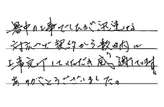 暑中の工事でしたが、迅速な対応で、契約から数日内に工事完了していただき、感謝しています。ありがとうございました。