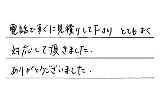 電話ですぐに見積りして下さり、とてもよく対応して頂きました。ありがとうございました。