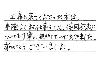 工事に来てくださった方は、手際よくお仕事をして、使用方法についても、丁寧に説明していただきました。有りがとうございました。