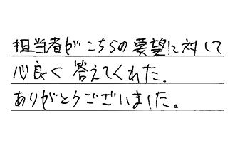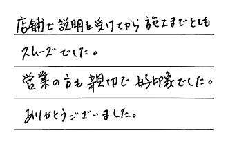 店舗で説明を受けてから施工まで、とてもスムーズでした。営業の方も親切で、好印象でした。ありがとうございました。