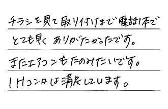 チラシを見て、取り付けまで電話1本で、とても早く、ありがたかったです。またエアコンもたのみたいです。IHコンロは満足しています。